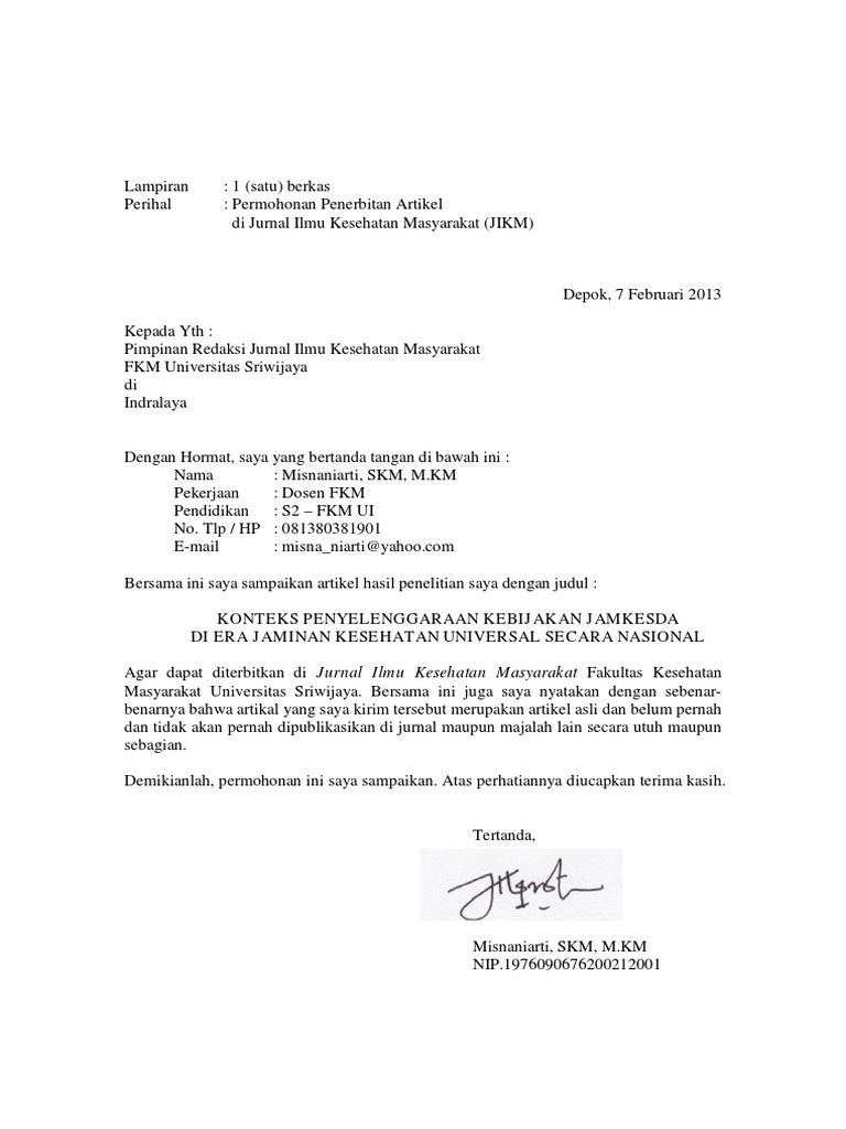 Anda harus memastikan bahwa judul makalah dan rincian penulis disertakan dalam cover letter secara jelas. SKCK Surat Keterangan Catatan Kepolisian 3. Terjemahan serupa untuk surat permohonan dalam bahasa inggris.